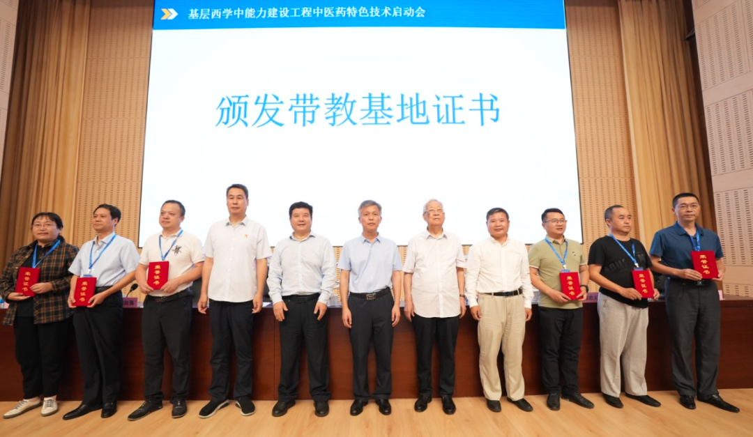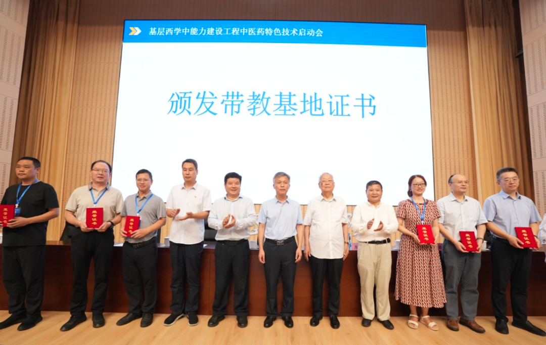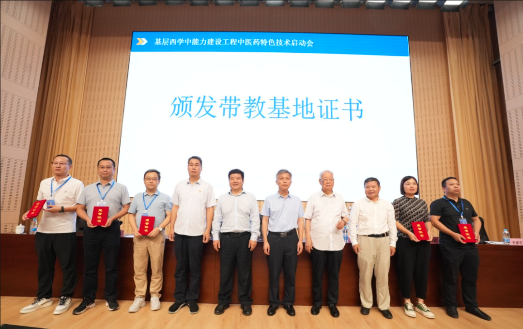 各位領(lǐng)導(dǎo)和專(zhuān)家為來(lái)自全國(guó)帶教基地負(fù)責(zé)人代表頒發(fā)了基層西學(xué)中能力建設(shè)工程帶教基地證書(shū)。