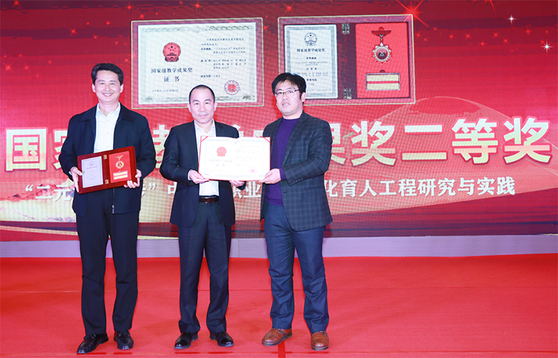 其中,在教學(xué)成果方面,由張立祥、郝炳金、鄭民、周慶強(qiáng)、崔維響、李梅、王雷、王亭、董錫安、孫昌杰等人完成申報(bào)的《“二元六向七步”中醫(yī)藥職業(yè)教育文化育人工程研究與實(shí)踐》榮獲由教育部頒發(fā)的職業(yè)教育國(guó)家級(jí)教學(xué)成果二等獎(jiǎng)。在報(bào)告現(xiàn)場(chǎng)特邀山東中醫(yī)藥高等專(zhuān)科學(xué)校機(jī)關(guān)黨總支書(shū)記郝炳金,教務(wù)處副處長(zhǎng)姜文鵬,為項(xiàng)目完成人代表董事長(zhǎng)孫昌杰頒獎(jiǎng),并就獲獎(jiǎng)經(jīng)驗(yàn)及成果發(fā)表重要講話!