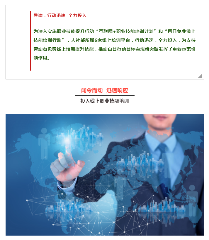 新冠肺炎疫情發(fā)生后,為確保職業(yè)技能提升行動(dòng)實(shí)施開(kāi)展,穩(wěn)定就業(yè)和促進(jìn)就業(yè),人社部會(huì)同有關(guān)部門(mén)積極推動(dòng)線上培訓(xùn)。?