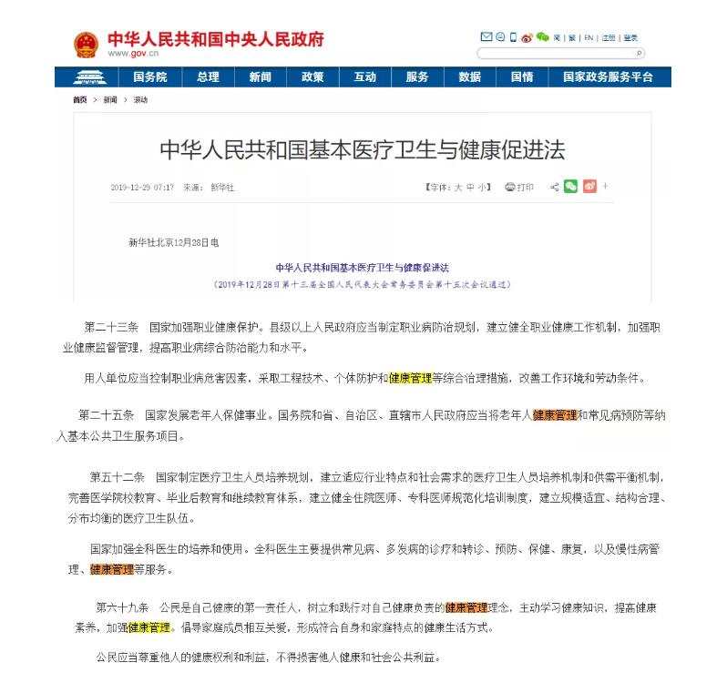 隨著國家重視程度不斷加強,2019年12月28日,在全國人大常委會第十五次會議通過的《中華人民共和國基本醫(yī)療衛(wèi)生與健康促進法》,將于2020年6月1日起正式實施。該法正式明確了健康管理的重要性,加強健康管理規(guī)范化,保護健康管理的可持續(xù)發(fā)展及穩(wěn)定性。