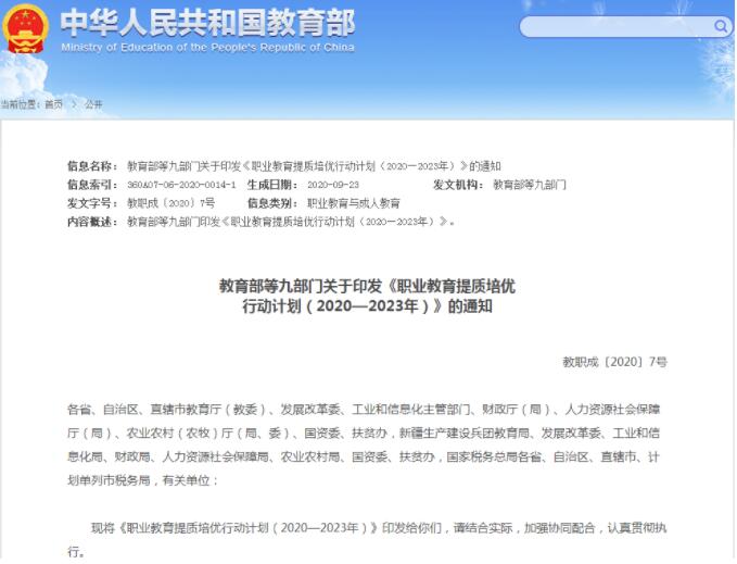 2020年,教育部等九部門聯(lián)合印發(fā)的《職業(yè)教育提質(zhì)培優(yōu)行動計劃(2020—2023年)》(以下簡稱《行動計劃》),著眼于技術技能人才的全面發(fā)展、職業(yè)發(fā)展、可持續(xù)發(fā)展,整體規(guī)劃、系統(tǒng)布局、著眼落實,必將成為今后一段時間職業(yè)教育人才培養(yǎng)的行動指南。