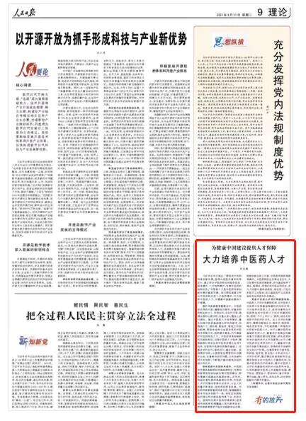 人民日?qǐng)?bào)2021年08月31日第09版發(fā)表一篇題為《為健康中國(guó)建設(shè)提供人才保障,大力培養(yǎng)中醫(yī)藥人才》的文章。文中指出:中醫(yī)藥學(xué)具有鮮明的實(shí)踐性特征,加強(qiáng)中醫(yī)藥人才培養(yǎng),需要教育引導(dǎo)學(xué)生將中醫(yī)藥學(xué)理論運(yùn)用于臨床,在堅(jiān)持中醫(yī)原創(chuàng)思維的基礎(chǔ)上,注重多學(xué)科合作,海納百川、融合創(chuàng)新。