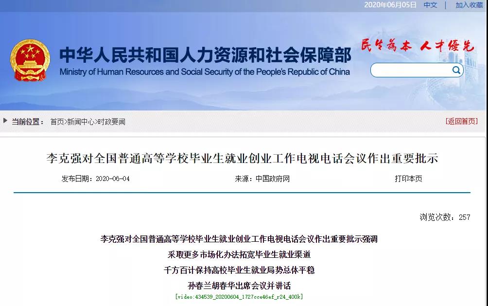 全國普通高等學校畢業(yè)生就業(yè)創(chuàng)業(yè)工作電視電話會議6月3日在京召開。中共中央政治局常委、國務院總理李克強作出重要批示。批示指出:高校畢業(yè)生就業(yè)創(chuàng)業(yè),關系千萬家庭幸福,關系財富創(chuàng)造、高質量發(fā)展。