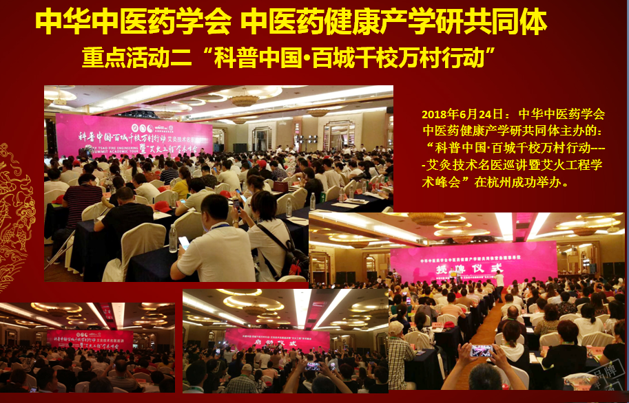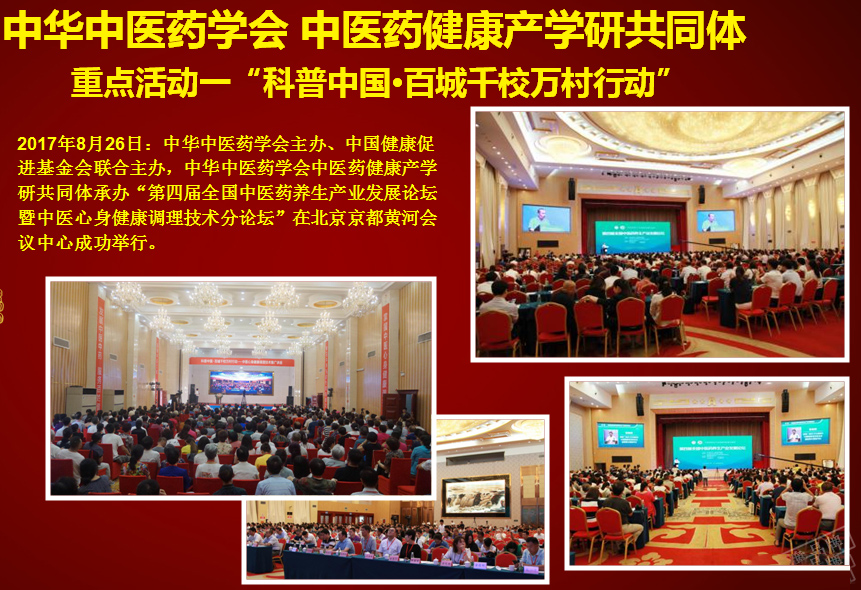 2017年8月26日:中華中醫(yī)藥學(xué)會(huì)主辦、中國(guó)健康促進(jìn)基金會(huì)聯(lián)合主辦,中華中醫(yī)藥學(xué)會(huì)中醫(yī)藥健康產(chǎn)學(xué)研共同體承辦“第四屆全國(guó)中醫(yī)藥養(yǎng)生產(chǎn)業(yè)發(fā)展論壇暨中醫(yī)心身健康調(diào)理技術(shù)分論壇”在北京京都黃河會(huì)議中心成功舉行。